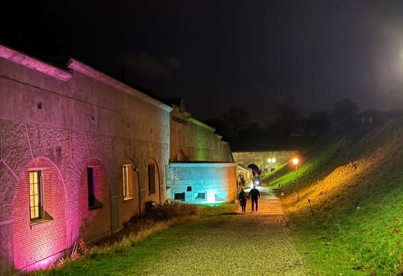 Hver halve time kan du komme på en guidet lanternetur rundt omkring fortet. Gå med fortets guide rundt i mørket og hør de gode historier om livet på fortet. Oplevelsen starter allerede, når I ankommer til fortet som vil være smukt oplyst af lys i mange farver.