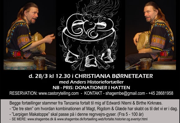 Anders Historiefortæller fortæller to eventyr fra Tanzania – DE TRE STEN – Afrikansk skabelsesmyte om hvordan jordens væsner alle er skabt af suppe fra Skabelsens Gryde på Skabelsens bålsted, med de trenødvendige sten til at holde gryden. LERPIGEN MAKATOPPE handler om hvor svært det kan være, hvis man bare er lavet af ler, især når det bliver regntid. (fra 5-10 år)