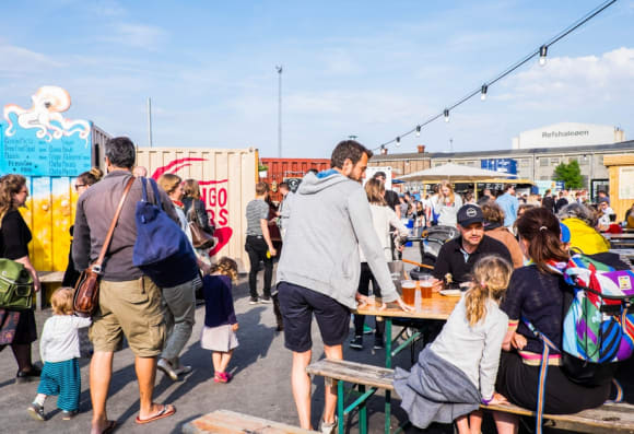 Reffen er en 10.000 kvadratmeter stor urban legeplads og streetfood-marked, hvor man kan nyde mad fra hele verden – fra flæskestegssandwiches og thai til græsk gyros og argentinske empanadas. Her finder du også masser af familievenlige events, musik, design og håndværk.