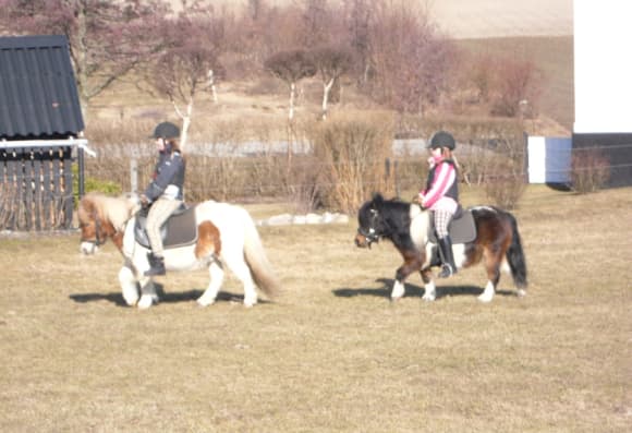 Vi har 3 Shetlandsponyer og 2 store ponyer, 3 dværggeder, 1 kanin, og lidt høns et par Gotlandske pelsfår samt gårdens hund Trille.