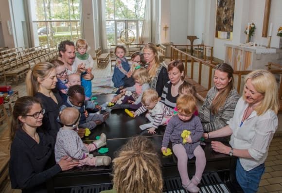 Vores musikpædagog leder rytmikken, som er en blanding af sang, dans og bevægelse. Forskning viser, at rytmikken styrker kommunikationen mellem barn og forælder.