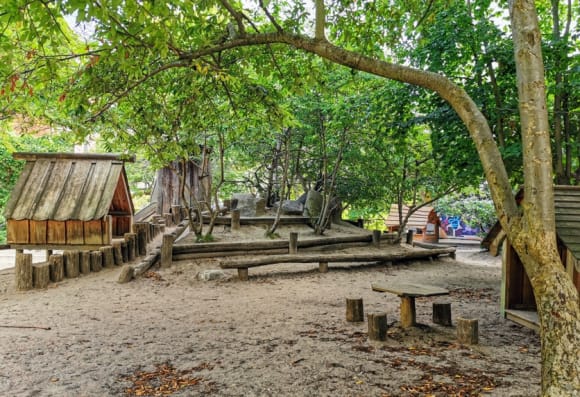 Et sted er der indrettet et cirkelformet legeområde med højt edderkoppenet og legeting hele vejen rundt, blandt andet: