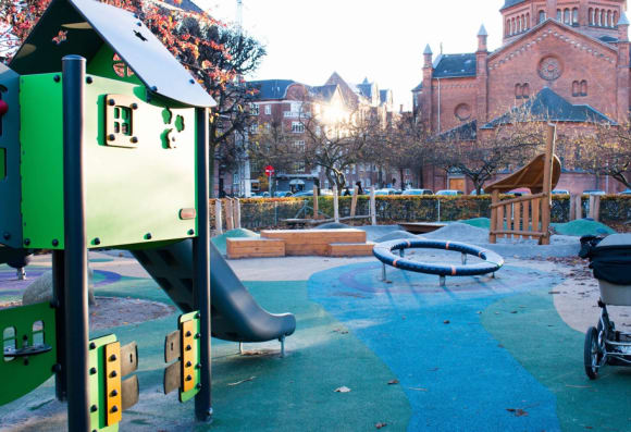 Nyrenoveret legeplads, der ligger som en del af parkarealet på Julius Thomsens Plads lige over for Forum.