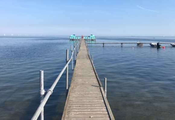 Mange har nok hørt om Dragørs børnevenlige strande, men kører man syd for Dragør kommer man til et boligområde “Søvang” der ligger helt ud til vandet og har sin egen badebro, der i 1997 blev udnævnt til at være danmarks længste af Guiness rekordbog. Vandet er ekstremt lavt så man skal ud på badebroen for at få sig en dukkert . Fra badebroen kan man gå ca. 300 meter ud i havet til nogle revler hvor det er sjovt at lege og se på fugle – eller få sig en badetur midt på åbent hav.